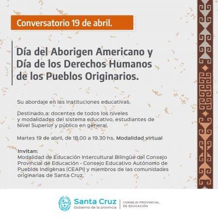 El Gobierno de Santa Cruz, a través del Consejo Provincial de Educación, desarrollará el martes 19 abril, un conversatorio sobre el Día del Aborigen Americano y Día de los Derechos Humanos de los Pueblos Originarios y su abordaje en instituciones educativas.