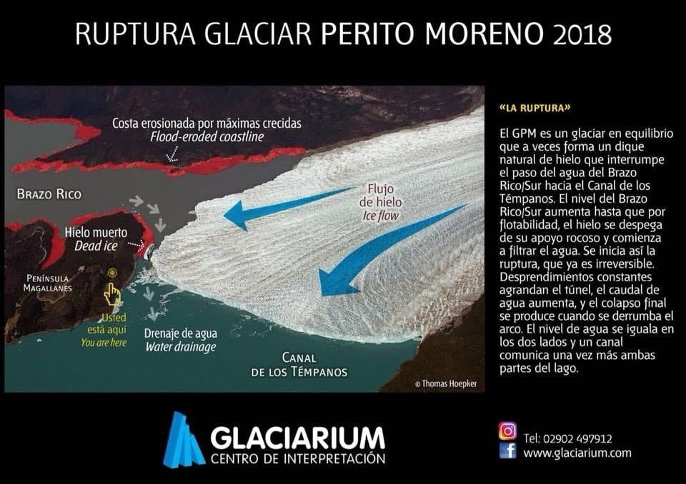El Perito Moreno es un glaciar en equilibrio que en ocasiones forma un dique natural de hielo, impidiendo el paso del agua del Brazo Rico/Sur hacia el Lago Argentino a través del Canal de los Témpanos (esta es la primera instancia que acaba de iniciarse recientemente). El proceso continúa de la siguiente manera.