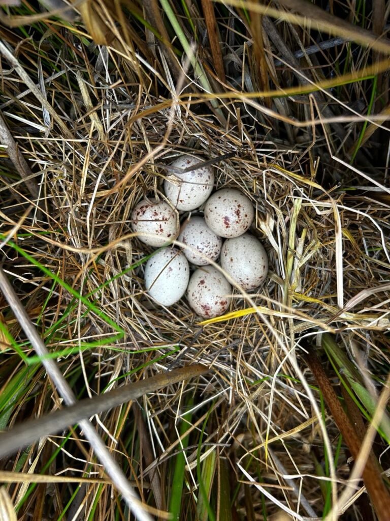Además del valor simbólico, el hallazgo permitió confirmar con datos concretos qué tipo de microhábitat necesita la gallineta para reproducirse. Emanuel cuenta que los nidos aparecieron en juncales con pastizales inundables, con pocos centímetros de agua y vegetación densa, pero lo suficientemente abierta como para permitir el desplazamiento. “Están construidos con gramíneas, con la base tocando el agua y la copa elevada, y conectados por pequeños pasillos que facilitan la movilidad y la huida ante predadores”.