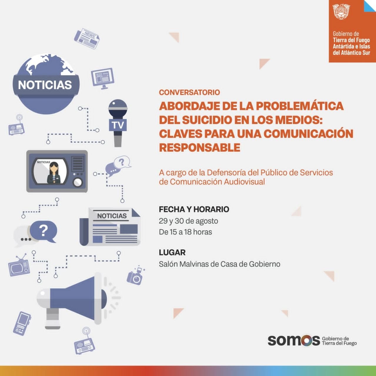Será el lunes 29 y martes 30 de agosto en el Salón Malvinas de Casa de Gobierno en Ushuaia. El con el tema central estará abocado al “Abordaje de la problemática del suicidio en los medios: claves para una comunicación responsable”.
