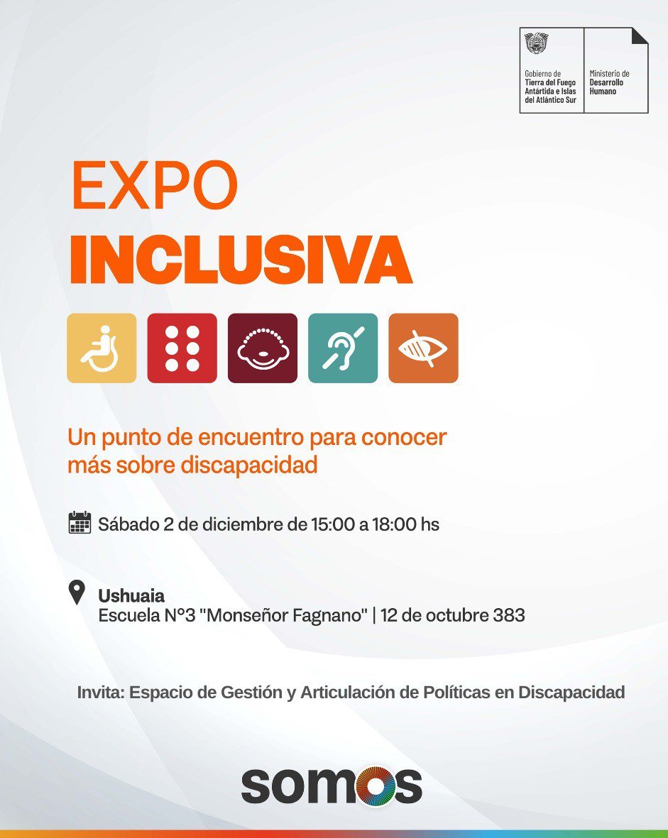 El Gobierno de la provincia de Tierra del Fuego AeIAS a través de la Subsecretaría de Gestión y Articulación de Políticas Sociales para Personas con Discapacidad, Secretaría de Niñez, Adolescencia y Familia del Ministerio de Desarrollo Humano, invita a la comunidad a la 2° edición de la “EXPO INCLUSIVA, un punto de encuentro para conocer más sobre discapacidad”.