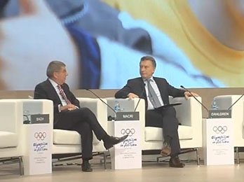 Junto a Thomas Bach, titular del COI, y la atleta Jennifer Dahlgren, el Presidente dio apertura al Foro “Olympism in Action”, desde el Centro de Exposi…