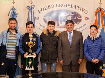 Los jugadores de fútbol de Ushuaia, Mateo Bustamante, Gonzalo Mamaní y Agustín Espek, acompañados por el profesor Diego Sánchez y sus familiares, tuvie…