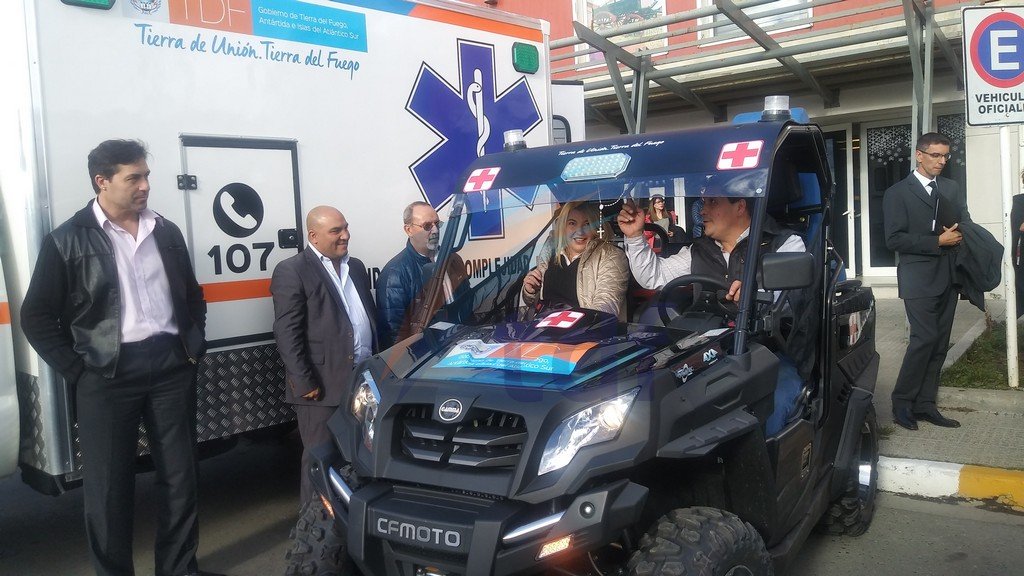 La gobernadora Rosana Bertone, junto al ministro de Salud Guillermo Ruckauf hicieron entrega este jueves en el Centro Cultural Yaganes de Río Grande de dos ambulancias 4 x 4 de alta complejidad, una para cada hospital, mientras que el UTV de auxilio y emergencia será destinado al Centro de Atención Tolhuin. *-*