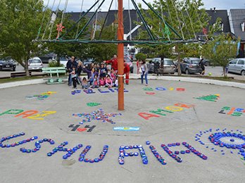 En la plaza de los Bomberos de la ciudad de Ushuaia, vecinos construyeron con tapitas de gaseosas un mensaje de paz en el marco de la fiesta navideña. …